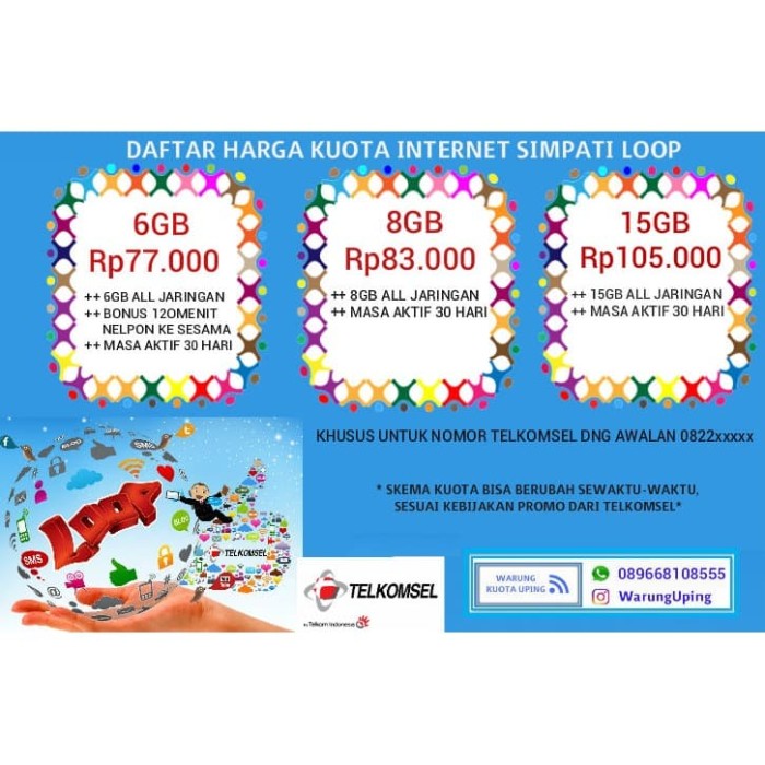 Telkomsel menargetkan kartu simpati loop kepada para pemuda khususnya para pelajar. Daftar kampus simpati loop : 75 menit nelpon ke operator lain, 125 menit nelpon antar telkomsel, 200 sms.supaya lebih akurat, kuota internet (2 kolom terakhir) kami bagi menjadi 2 segmen sebagai salah satu varian layanan dari salah satu provider terbesar di indonesia, loop. Mungkin karena sosialisasi dari telkomsel yang kurang. Aplikasi my telkomsel juga berguna sebagai cara cek kuota simpati loop.